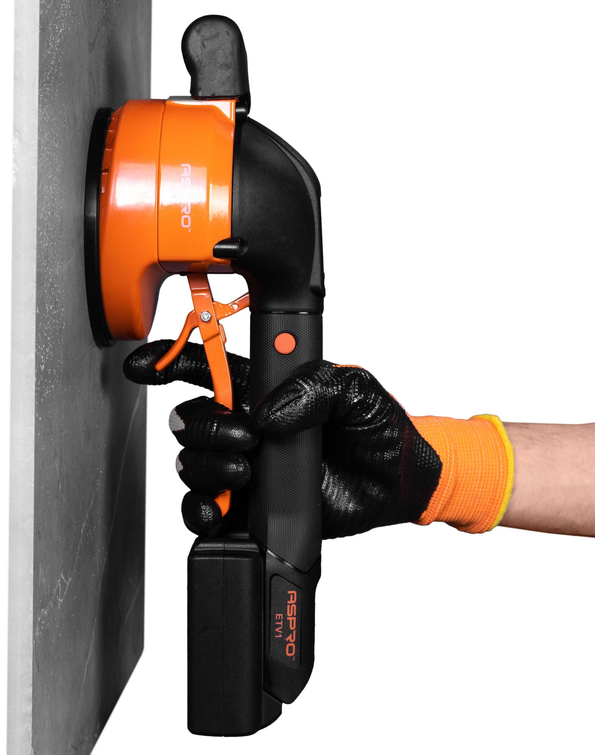 ASPRO-ETV1 подходит для плитки с максимальным размером до 100x100 см и может использоваться для манипуляций и подъема плитки с гладкой, шероховатой или слегка рельефной поверхностью. Устройство сочетает в себе функции присоски и вибратора, обеспечивая идеальное сцепление плитки с полом или стеной. Частота вибрации легко регулируется в соответствии с размерами плитки, значительно повышая эффективность работы. Разряжение (вакуум) в присоске создается и снимается одним нажатием кнопки.